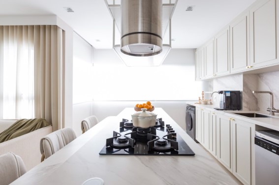 Nessa nova configuração, ganham espaço a presença da ilha ou península, circulação confortável e eletros modernos como o cooktop e o forno elétrico embutido, entre outros, além da necessária coifa para conter a gordura e os odores.