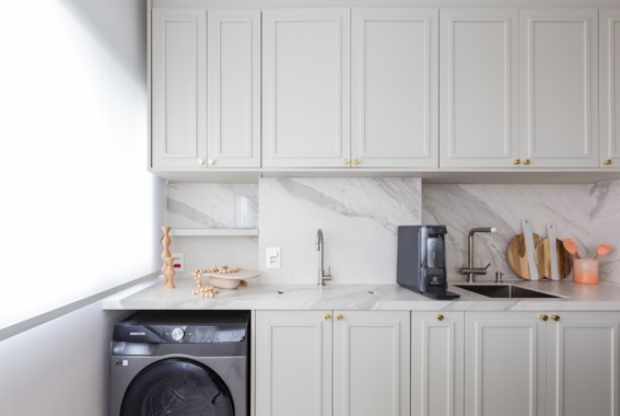 O fato de ser compacta – embora a integração a tenha tornado mais espaçosa –, não impediu que Mari incluísse absolutamente tudo que a cliente precisa. Inclusive um cantinho para a máquina lava e seca, além de um tanque que é acessado após retirar a pedra que o cobre | Projeto da arquiteta Mari Milani | FOTO: Mariana Camargo