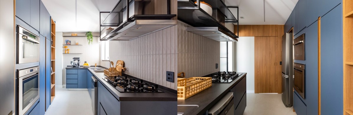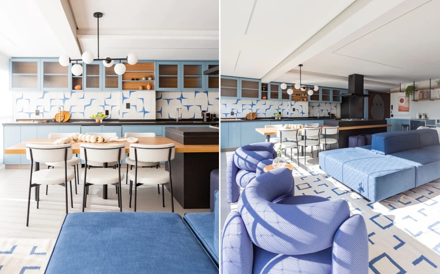 Para um jovem casal, a arquiteta Mari Milani remodelou o layout e levou a cozinha para a varanda! Com a área conquistada a partir da integração desse espaço, a estrutura tornou-se mais ampla e solar. Percebe-se também a sintonia do azul, que além da marcenaria da cozinha, está presente inclusive no revestimento do backsplash, móveis e tapete | FOTO: Mariana Camargo