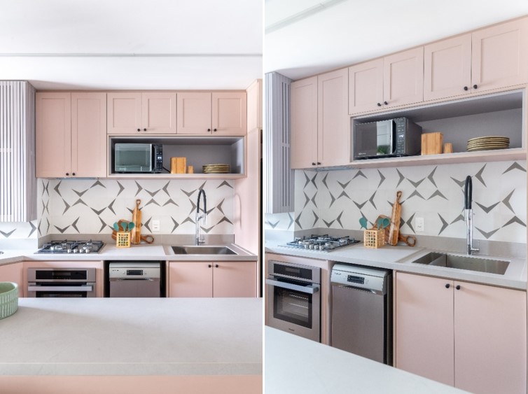 Com o retorno das cores para a cozinha, é mais comum que os moradores se decidam pela marcenaria com tons de verde e azul, mas para Mari Milani, o rosa também tem o seu espaço garantido!
