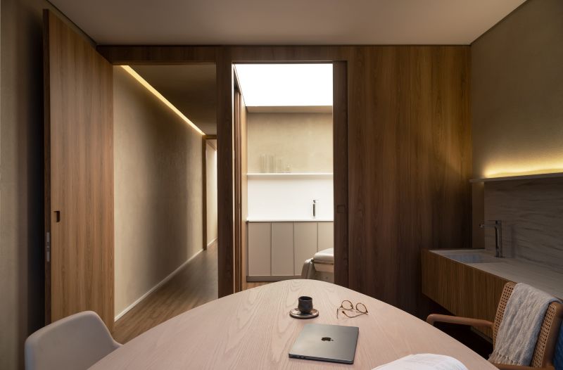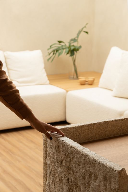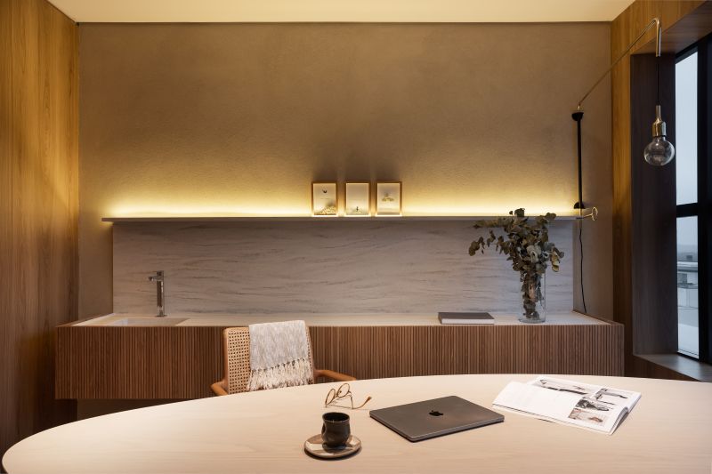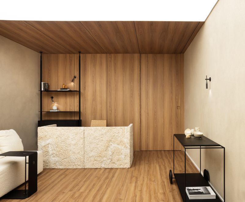 Entre o acolhimento e a inovação, a arquiteta definiu uma paleta de materiais e texturas com a convicção de intensificar a atmosfera sensorial. Logo na recepção, o balcão de atendimento esculpido em bloco de pedra natural ganha protagonismo com a tela tensionada ao fundo. Este recurso, que simula a luz natural, também contribui para uma iluminação difusa e acolhedora, especialmente em uma sala alongada e sem janelas.