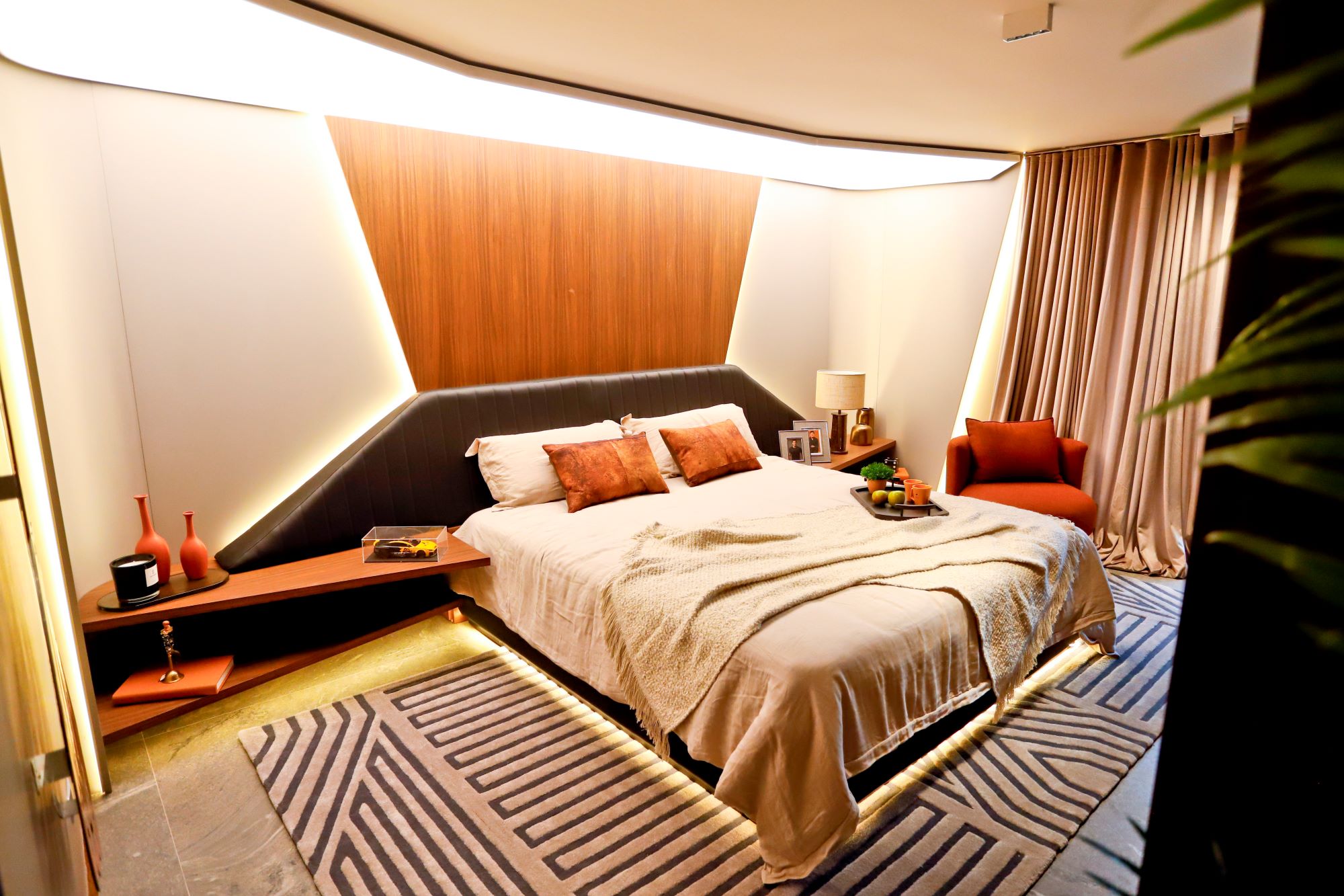 Na Suíte do Empresário, projetada pelas arquitetas Rosa Dalledone e Camila Dalledone Gasparin, os móveis da Movepar dão vida a curvas aerodinâmicas inspiradas no design automotivo, aplicadas a painéis e ao mobiliário em MDF. O uso de tons amadeirados profundos dialoga com a iluminação estratégica e reforça o caráter contemporâneo do espaço.