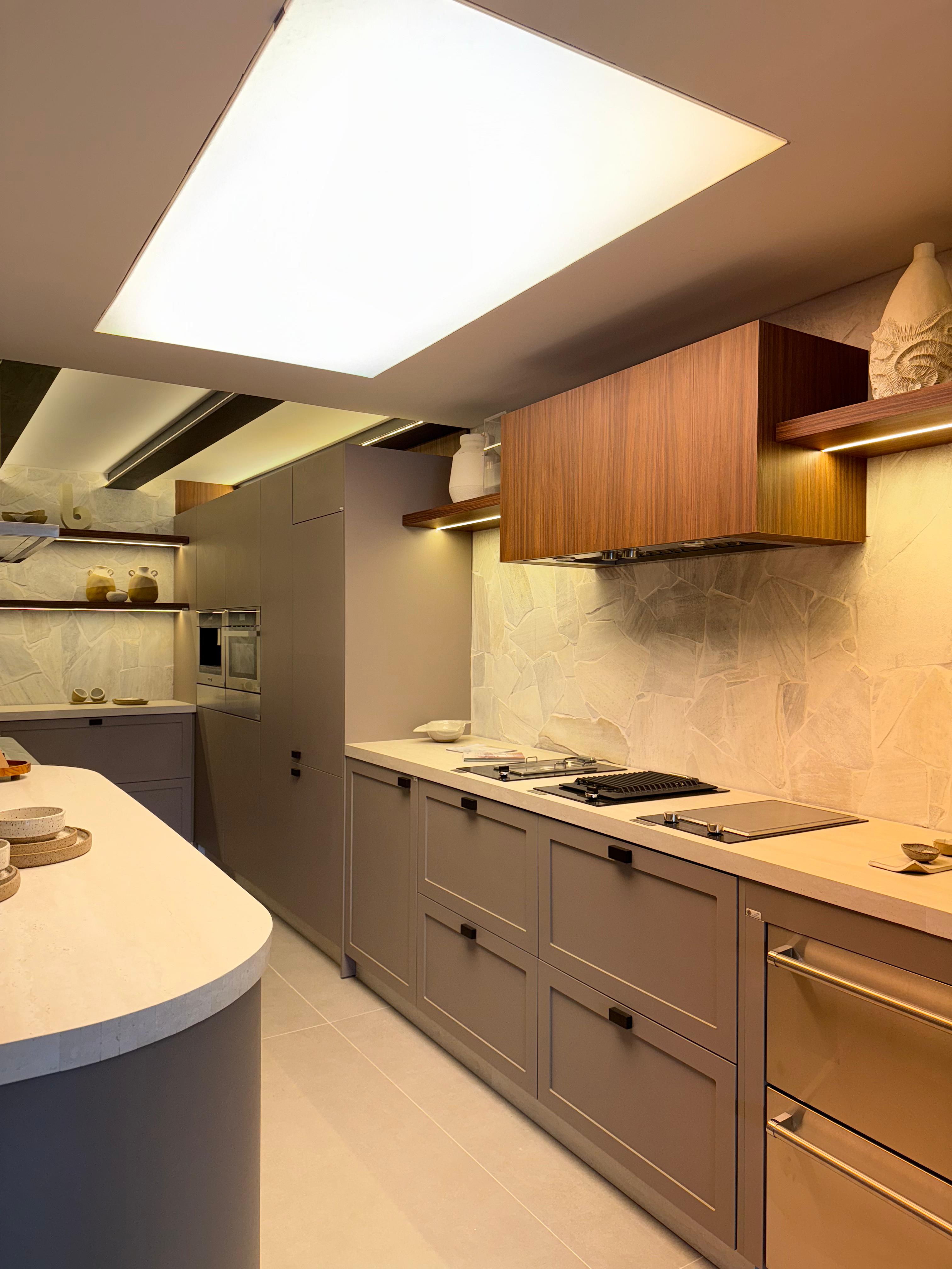 Já na Cozinha Gourmet e Jardim, assinada pela arquiteta Viviane Busch, a marcenaria planejada traz o MDF em acabamentos claros e texturas naturais, criando contraste com pedras e vigas aparentes. Nesse ambiente, um detalhe que se destaca é a aplicação de palha natural em portas da despensa, solução que valoriza o toque artesanal e conecta o mobiliário à tendência de aproximar os interiores da natureza. A integração entre madeira, fibras naturais e iluminação embutida traduz o conceito de “novo luxo”, em que a sofisticação se expressa pela personalização e pela escolha criteriosa dos materiais, sem excessos.