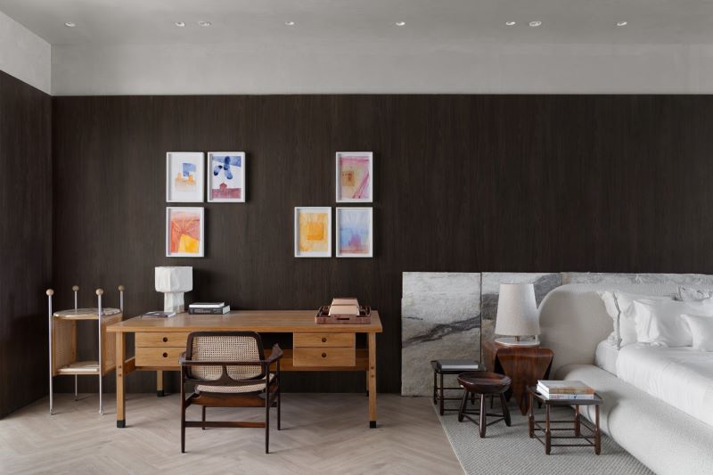 No caso da suíte integrada, a delimitação de espaços pode ser feita de maneira sutil e funcional. O uso do mobiliário como divisória, como um armário ou estante entre o dormitório e o home office, é uma estratégia eficaz. Além disso, tapetes e cabeceiras de cama ajudam a marcar visualmente o ambiente, criando sensação de setores bem definidos sem perder a integração que caracteriza o loft.