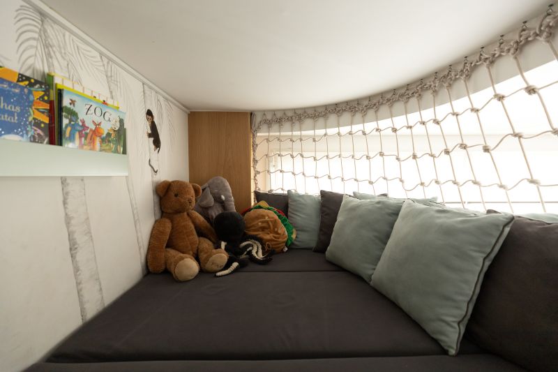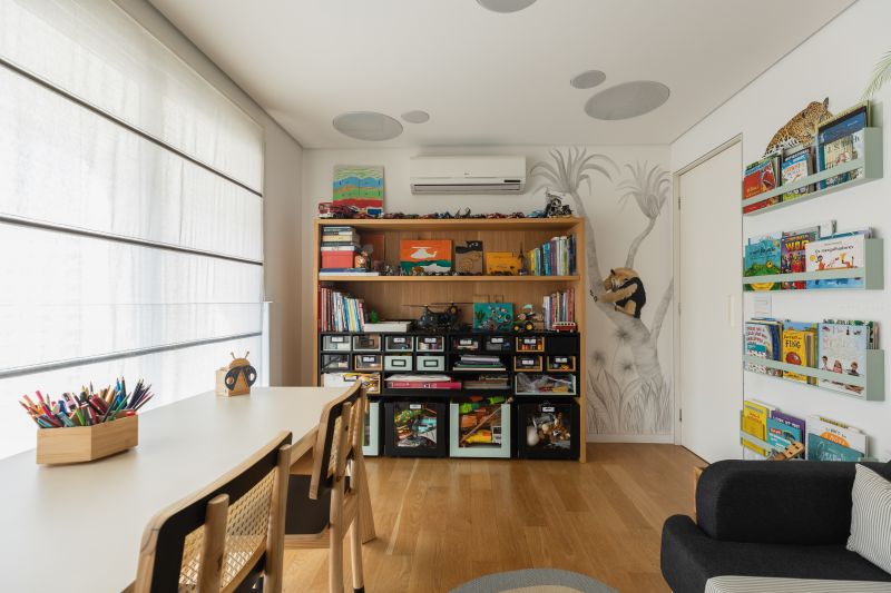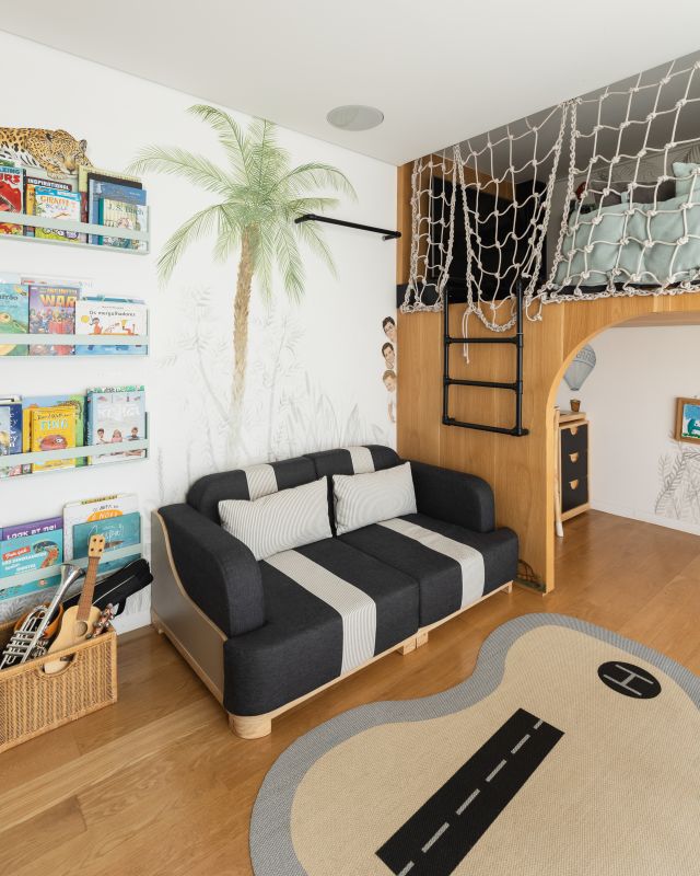 A solução foi dividir o espaço em dois níveis, garantindo usos distintos sem comprometer a convivência. Na parte superior, um pequeno mezanino abriga o canto dos mais velhos, voltado a jogos, leitura e momentos de descanso. A parte inferior foi destinada às brincadeiras e atividades artísticas do caçula, permitindo que todos compartilhem o mesmo ambiente de forma harmônica.