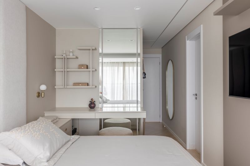 Nos quartos, a atmosfera se mantém suave. O quarto principal explora uma paleta clara com cabeceira estofada e armário com portas em vidro reflecta, que amplia visualmente o ambiente. Já o quarto infantil equilibra função e fantasia: marcenaria inteligente, espaço para brincar e uma cartela cromática que acolhe e mantem a uma atmosfera de aventura e diversão.