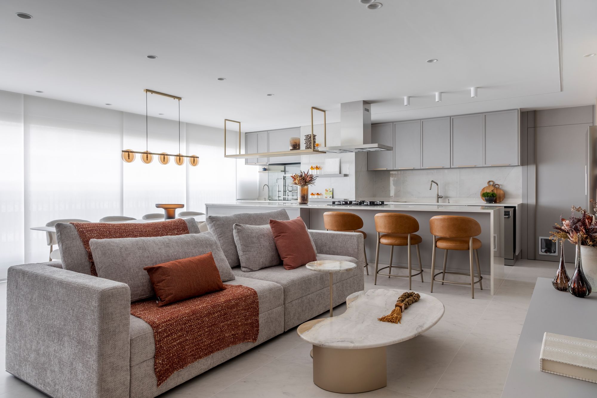 A cozinha segue o mesmo tom claro e atemporal, com armários cinzas, iluminação linear embutida e uma bancada em Ultra compacto que conecta as áreas sem interrupção visual. A cristaleira e bar iluminados e com acabamento em vidro reflecta adicionam sofisticação à composição, ao mesmo tempo em que respondem ao hábito de receber dos moradores.