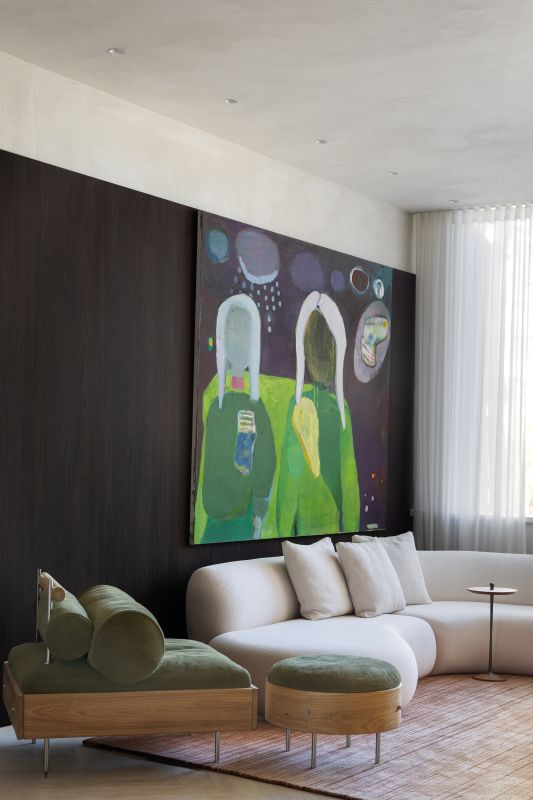 A proposta adquire contornos contemporâneos por meio dos móveis da Way Design, como a cama e o sofá em bouclé — tecido que se destaca pelo toque macio e pelo conforto tátil — além de uma mesa de centro de caráter escultórico, que estabelece um diálogo entre arte e funcionalidade, marcas do design brasileiro atual. A poltrona Basquete, da Mula Preta, adiciona cor e conforto atemporal ao ambiente.