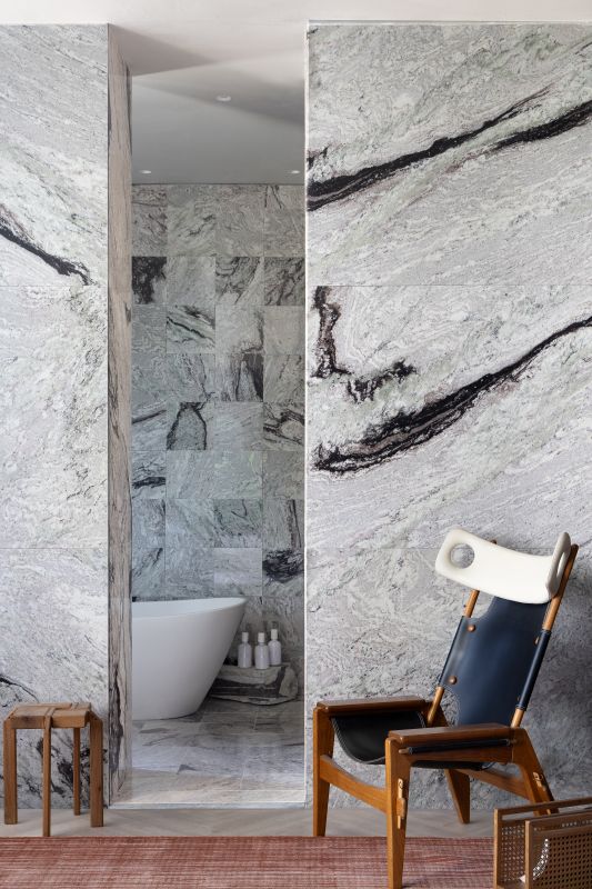 O projeto também homenageia a história e o legado do design nacional ao incorporar peças icônicas de Sérgio Rodrigues, nome essencial para o reconhecimento internacional do mobiliário brasileiro, como a clássica poltrona Xibó, a escrivaninha e os bancos Mocho e Magrini, posicionados nas laterais da cama como apoio.