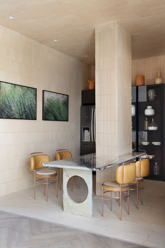 O espaço do arquiteto é um verdadeiro manifesto do design nacional. Do Ateliê Gustavo Bittencourt, o ambiente recebe a poltrona Bernardo, as poltronas Iaíá e um elegante carrinho bar, todos em madeira natural com linhas suaves e formas orgânicas — elementos que exaltam a tradição da marcenaria brasileira e a valorização do trabalho artesanal.