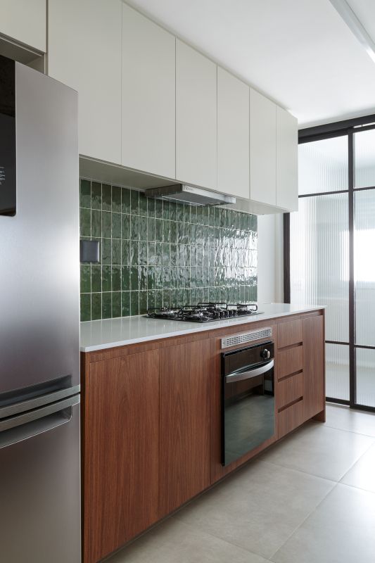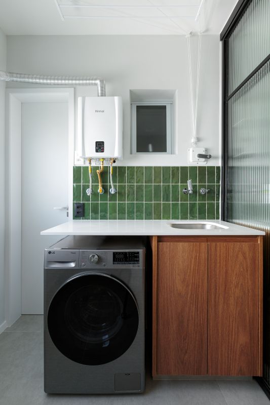 A identidade visual do projeto se apoia em tons neutros e superfícies naturais, pontuadas pelo revestimento verde que reveste o frontão da cozinha e da lavanderia. Essa escolha, feita na Portobello Shop, imprime personalidade e frescor ao conjunto, dialogando com a marcenaria sob medida executada pela Made Marchi.