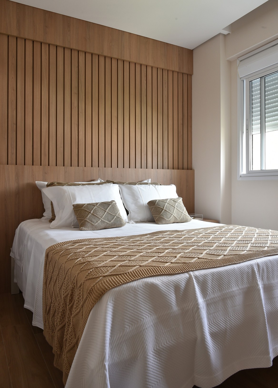 Painel ripado que compõe a cabeceira - esse estilo é bastante solicitado nos projetos de decoração atualmente / Projeto de VilaVille Arquitetura e foto de Sidney Doll