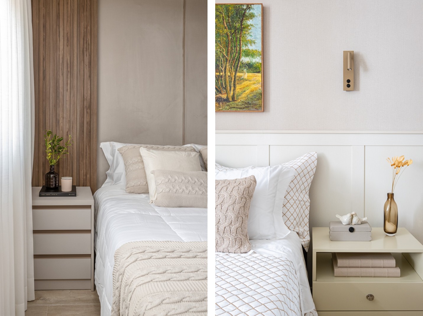 Esse móvel de apoio é essencial para acomodar objetos de uso rápido e cotidiano, como uma moringa com água, livros, uma luminária de mesa pequena, um despertador, o celular, entre outros. Em geral, o indicado que a mesinha seja da mesma altura ou um pouco mais elevada que o colchão (cerca de 5 a 10 cm no máximo), para facilitar o manuseio desses itens. Isso também vale em casos de nichos ou prateleiras embutidas na cabeceira.