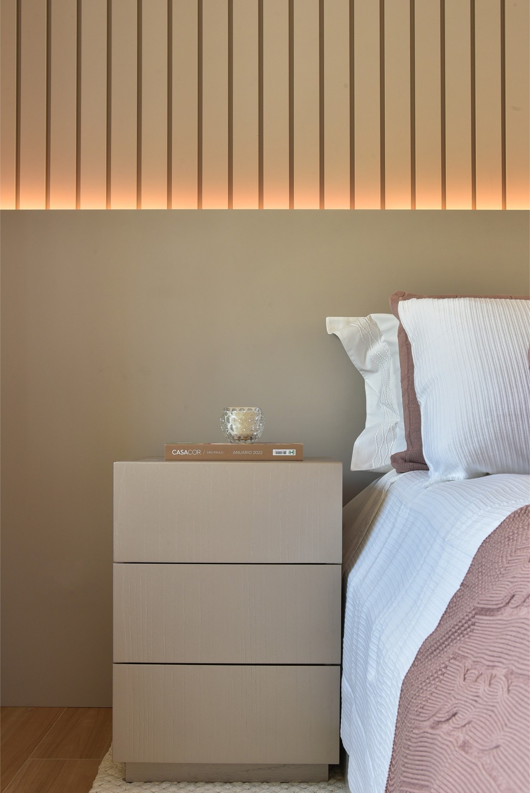 Exemplo de luz de temperatura de cor branco quente e efeito indireto junto à cabeceira da cama / Projeto de VilaVille Arquitetura e fotos de Sidney Doll