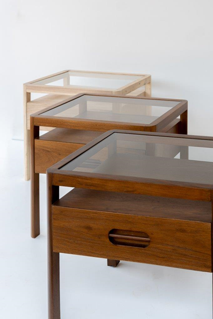 Disponíveis em três tamanhos em modelos de uma e duas gavetas, o móvel se destaca pelo desenho que mescla personalidade e funcionalidade, a exemplo do tampo de vidro, suavemente afastado do gaveteiro, solução que cria um espaço generoso para apoio onde objetos dispostos abaixo se destacam como em uma vitrine.
