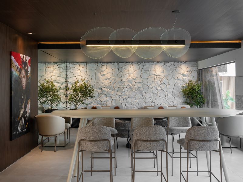 Com 156 m², o Semente Viva Gastrobar integra arquitetura e a gastronomia assinada pelo Divinna Mesa. Texturas, madeira, pedras e vegetação trazem equilíbrio entre conforto e elegância. O espaço foi concebido para ser aconchegante e convidativo, proporcionando bem-estar e convivência em um ambiente que se conecta ao percurso da mostra.