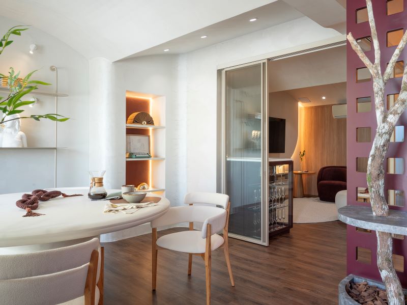 No ambiente corporativo Janelas para o Mundo (44 m²), a estreante Sabrina Ferreira cria uma sala para a Dimas Construtora. O espaço acolhe visitantes e clientes, permitindo reuniões privativas em uma atmosfera de pertencimento. Cores suaves, natureza e uma ampla janela conectam o ambiente ao jardim da mostra, reforçando a ideia de sonho e contemplação.