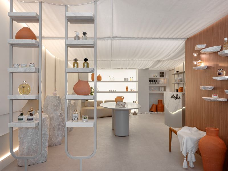 A arquiteta Beatriz Tambosi estreia com a loja de aromas oficial da mostra, a Mels Brushes, e vai além da função comercial. Em 45 m², texturas naturais, iluminação suave e cerâmicas artesanais criam uma experiência sensorial, onde o olfato conduz a memória e transforma a visita em pausa, emoção e contemplação.