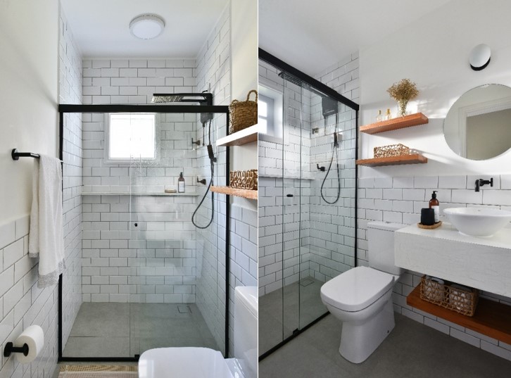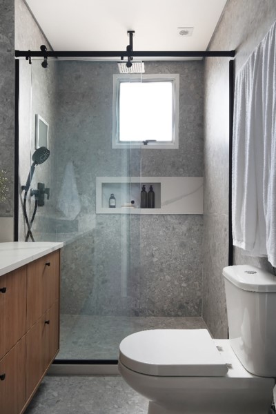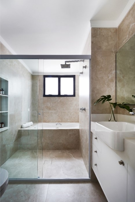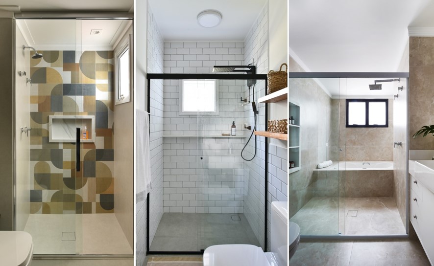 Os nichos embutidos conquistaram a arquitetura de interiores: com a abertura de um vão na parede com, pelo menos, 10 cm de profundidade, na experiência de Rosangela eles entregam eficiência e um visual minimalista. "Guardar o shampoo e o condicionador no nicho é tão intuitivo que fica muito difícil deixar o box desorganizado", comenta.