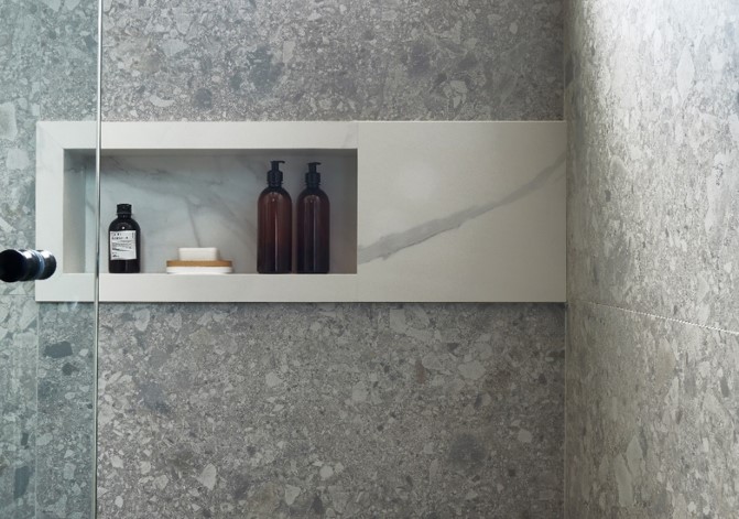 O design do nicho executado ficou ainda mais interessante com o arranjo entre a estética do granilite e o efeito marmorizado da lâmina sinterizada que reveste o interior do nicho e se estende até o final da parede | Projeto: Rosangela Pena Arquitetura | FOTO: Sidney Doll