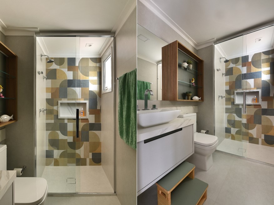 E ao invés de suportes que ocupam espaço e se deterioram com o peso dos produtos e o tempo de uso, a profissional aponta o nicho embutido como o recurso ideal para acomodar os itens de higiene.