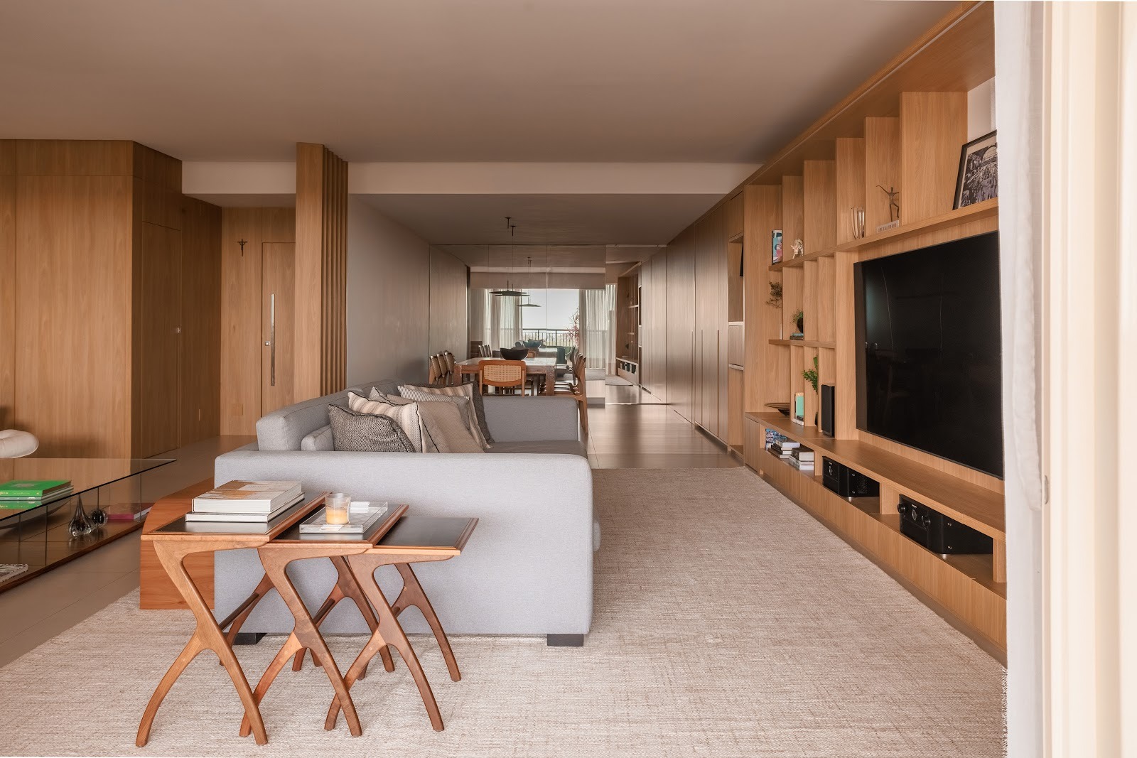 No estar, uma estante generosa, com nichos de diferentes tamanhos, foi criada para guardar as muitas memórias de viagens do casal e objetos de valor afetivo, além de abrigar a TV de forma discreta, criando um ambiente em que a família possa se reunir com frequência. O móvel ainda se prolonga até o jantar, embutindo a porta de acesso à área íntima, e servindo também como louceiro. Outro recurso utilizado ali foi revestir toda a parede de fundo da sala de jantar com um espelho que traz a vista para dentro do apartamento.