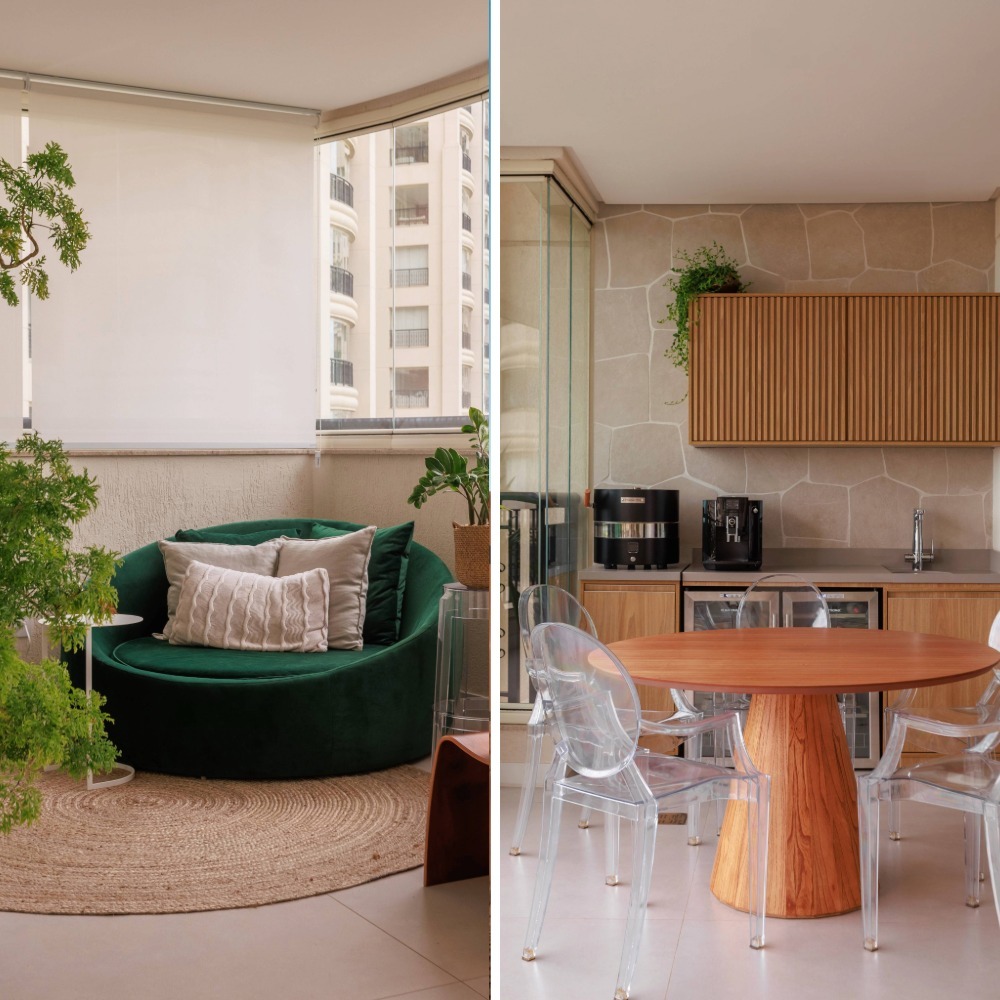 Já a varanda teve a esquadria original mantida. Dessa forma, ela pode ser integrada ou isolada do restante da área social. O espaço ganhou praticidade com pia, ponto de café, adega, cervejeira e forno de pizza portátil. Além de diferentes ambientes: mesa de jantar; um setor de encontro com poltronas e mesa de centro; e um cantinho de leitura e contemplação com chaise, na parte localizada em frente à suíte principal.