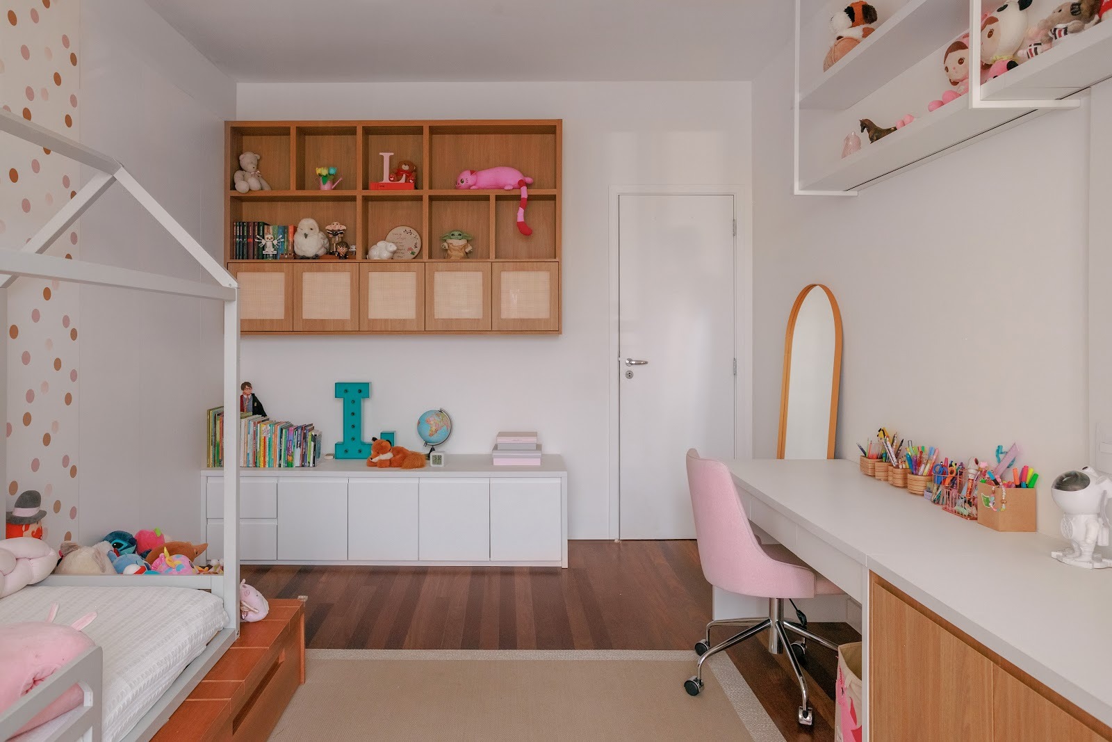 O quarto da filha foi pensado para acompanhar o crescimento dela. Hoje, a marcenaria está repleta de brinquedos e abriga também espaço para estudar, ver TV, receber amigos e brincar. As cores são claras e suaves, como a personalidade doce da menina.