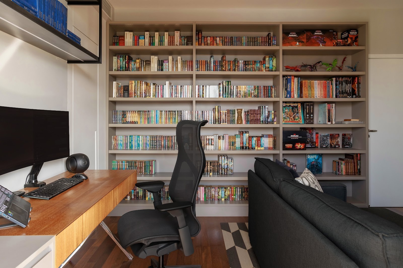 A terceira suíte foi transformada em escritório para o pai, que trabalha no mercado financeiro. Ali, além de espaço de trabalho com uma escrivaninha, foi criada uma marcenaria em nichos que abriga livros e jogos eletrônicos. Uma grande TV, um sofá confortável e um sistema de som de última geração complementam o ambiente que é usado também para que ele receba os amigos para tardes/noites de jogos.