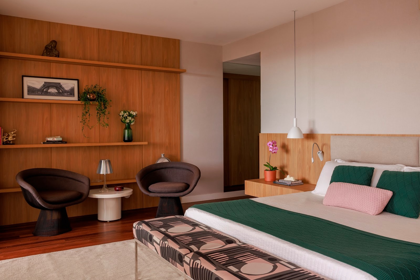 Para a parte íntima, que manteve as quatro suítes originais, foi escolhido um único piso de madeira natural. A suíte principal foi o ambiente que teve maior alteração no layout. O espaço ganhou um super closet, para ela, e um grande armário, para ele; além de um canto de leitura com painel de madeira e poltronas confortáveis para o casal. A cama foi posicionada de frente para a vista. E o banheiro ganhou mais funcionalidade com nova bancada e marcenaria planejada.