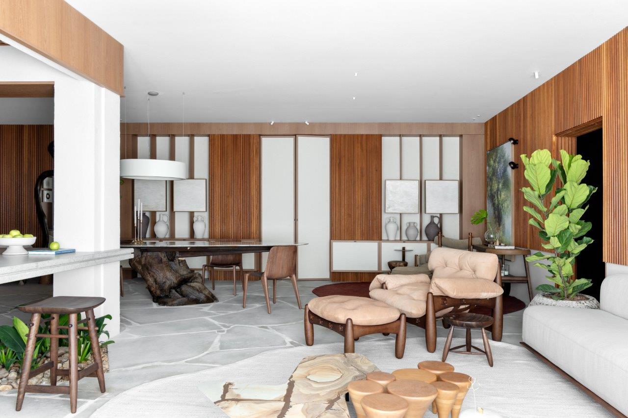 Entre os destaques está a mesa de jantar desenvolvida em colaboração com a Residual Design e a MG3 Mármores. A base escultórica, formada por um tronco de madeira reaproveitado e trabalhado artesanalmente, sustenta um tampo de quartzito Capadócia, cuja superfície exibe veios fluidos e tonalidades quentes. A peça sintetiza memória, inovação, natureza e sofisticação, transformando-se em um dos pontos centrais do espaço.
