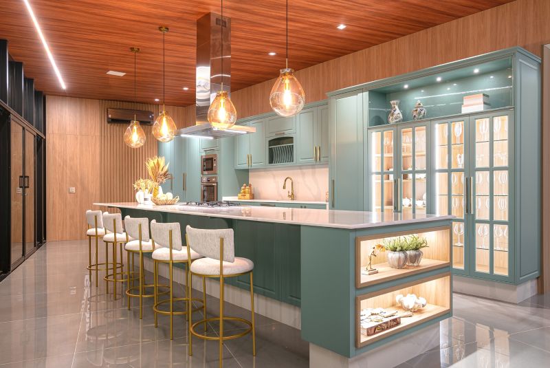 Em um dos projetos mais arrojados, o uso de um verde-água suave para os armários e bancada proporciona uma sensação de frescor e harmonia ao ambiente. Essa escolha, longe de ser comum, mescla-se com a cristaleira de vidro e os nichos iluminados, trazendo um toque de leveza e sofisticação. O contraste do piso em porcelanato, que se une ao teto de madeira escura, cria uma atmosfera acolhedora e sofisticada sem perder a modernidade. As paredes com painéis ripados de madeira complementam a composição, adicionando textura e um visual contemporâneo que se mantém elegante e atemporal.
