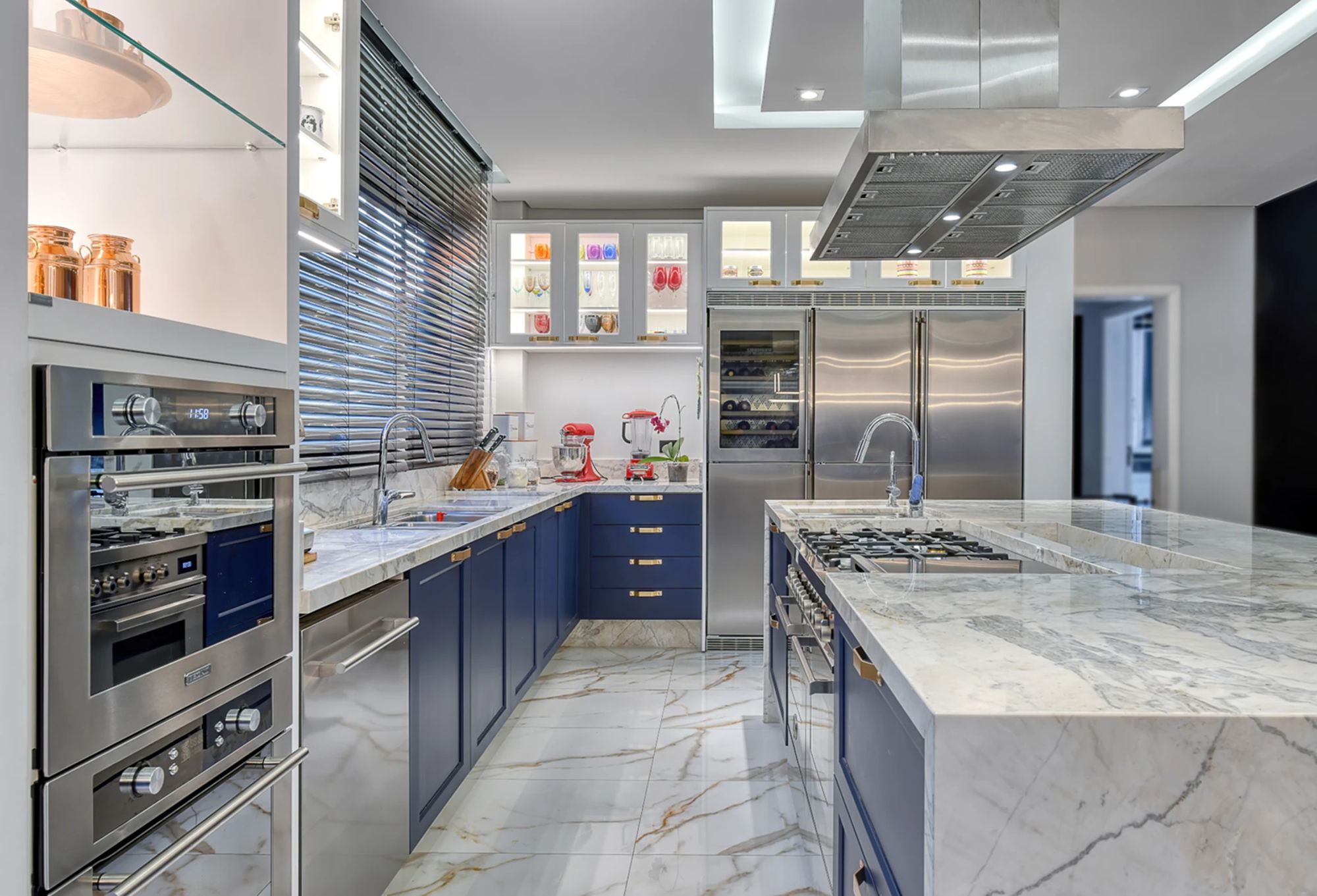 Outro projeto de destaque traz o azul profundo como tom principal da marcenaria, criando uma composição elegante e única com os eletrodomésticos de inox e a bancada de mármore. O acabamento dourado dos puxadores, sutil, mas marcante, eleva o ambiente a um patamar de luxo sem excessos. A torre quente, projetada para embutir os fornos, é parte integrante da marcenaria personalizada, oferecendo funcionalidade sem renunciar ao design. Cada detalhe é pensado para maximizar a organização e a amplitude do espaço, criando um ambiente sofisticado sem perder a praticidade.