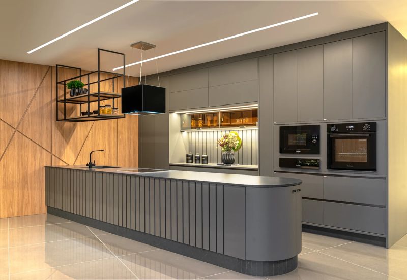 Para quem busca um estilo mais sóbrio e moderno, a opção em cinza grafite é perfeita. A cozinha, com um mobiliário linear e sem puxadores, reflete a tendência minimalista, mas com uma sofisticação única. A bancada curva e ripada em madeira traz um toque de suavidade ao visual, enquanto os nichos com portas de vidro e iluminação embutida proporcionam funcionalidade e beleza. A prateleira suspensa, que mescla metalon e madeira, adiciona um elemento industrial e contemporâneo ao espaço, dando-lhe um charme extra. O projeto, como um todo, transmite uma sensação de leveza e elegância sem abrir mão da praticidade do dia a dia.