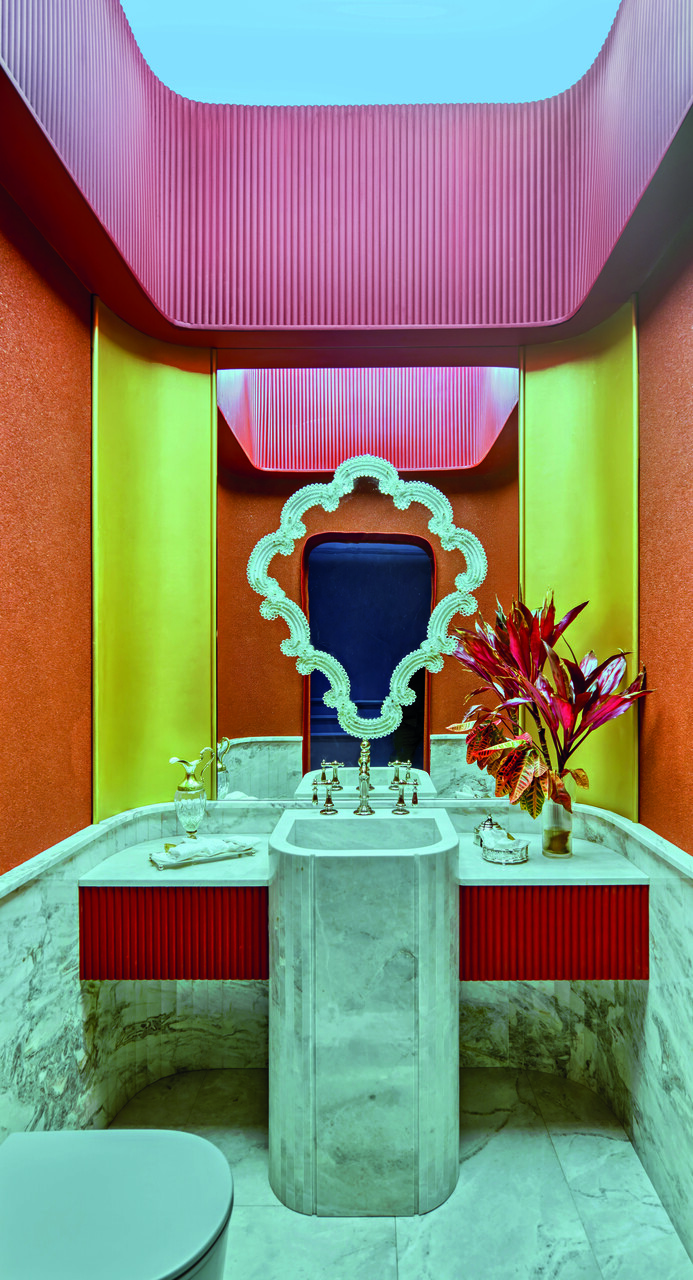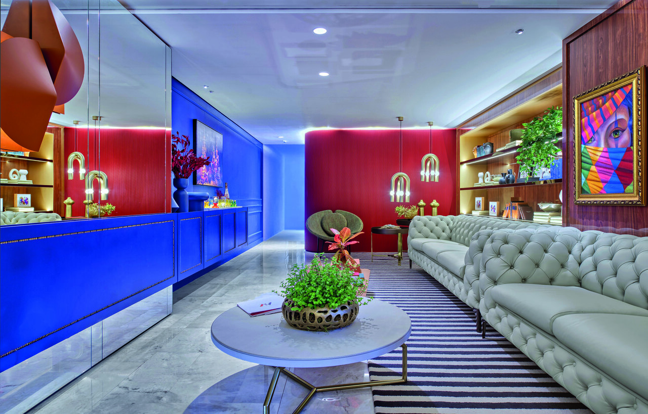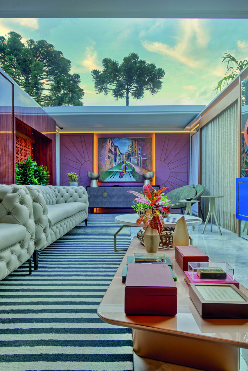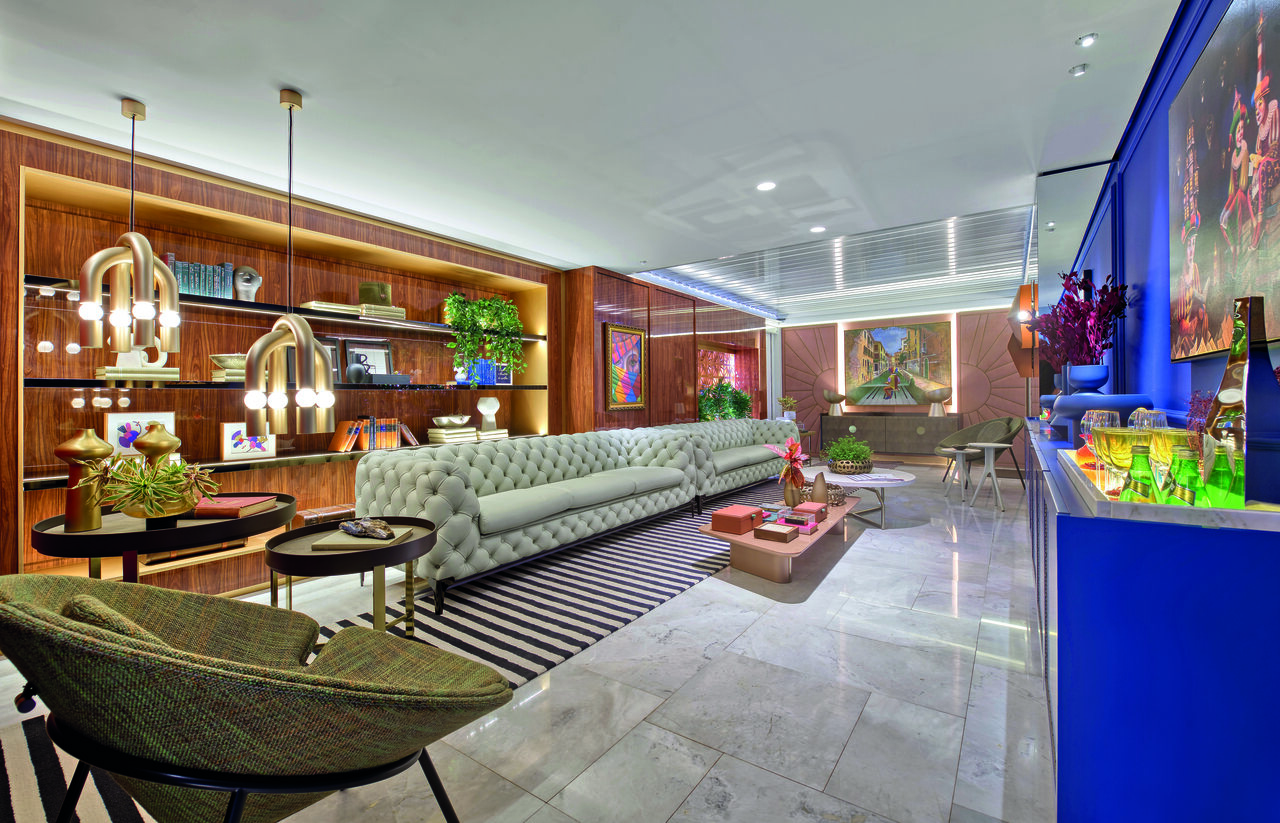 Os materiais nobres, como mármore Violino, madeira e tecidos sofisticados (veludo, couro, camurça e tramas coloridas), convivem com uma paleta intensa e afetiva: vinho, azul, rosé e verde. O mobiliário, majoritariamente da marca internacional Hommes Studio, é composto por peças que funcionam como esculturas funcionais, com forte espírito fashionista.