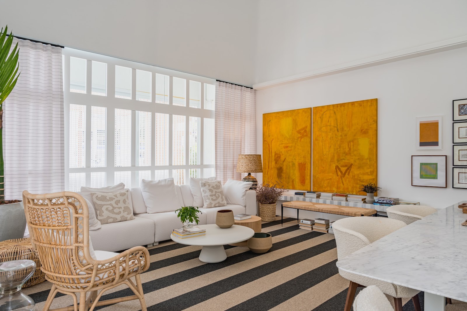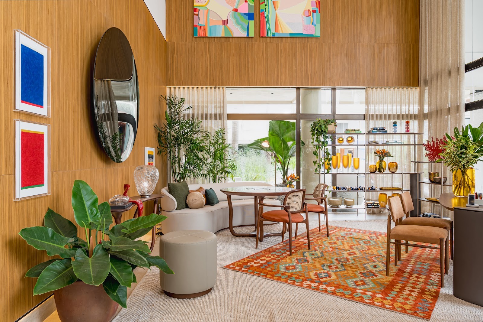 A base neutra e rica em texturas ganhou tons vibrantes de vermelho, amarelo e azul, além do verde das plantas. Os quadros coloridos em acrílico do Ricardo Homem e as pinturas em óleo da Romilda Pérez ajudam a trazer ainda mais cor ao ambiente da Artefacto, decorado por Bia Seiler, que tem ainda vasos amarelos e um kilim da Casa Júlio. "A arte também pode florescer em ambientes cheios de vida e contraste, não apenas em composições monocromáticas", explica Bia.