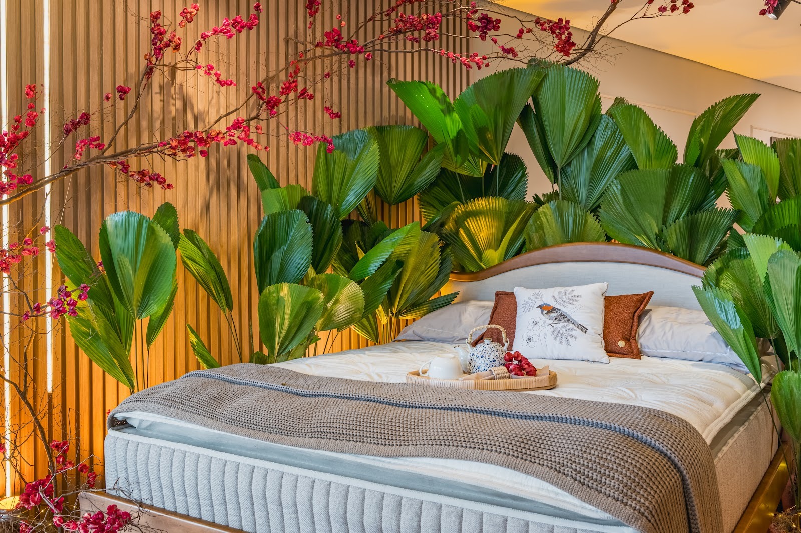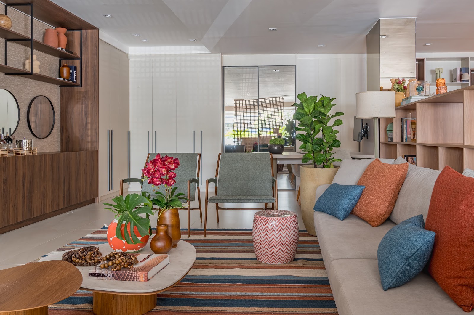 Um ambiente para sentir e desacelerar. A sala de TV e quarto criados por Andrea Duarte e Anna Malta na Madeirol tem pisos, marcenaria e móveis em tons de beges, cinzas e cru. Mas a cor entra aqui de forma expressiva nos objetos, almofadas, tapetes e colchas, trazendo vida sem tirar a leveza. "É a cor que traz personalidade ao espaço", diz Andrea Duarte. Neste caso, a dupla optou por tons terrosos, matizes de azuis e verdes que se integram, como na natureza. As plantas completam o décor trazendo frescor e movimento. "O resultado é um espaço que acolhe, inspira e transforma — um refúgio onde a simplicidade dos neutros se encontra com a alma das cores", diz Anna Malta.