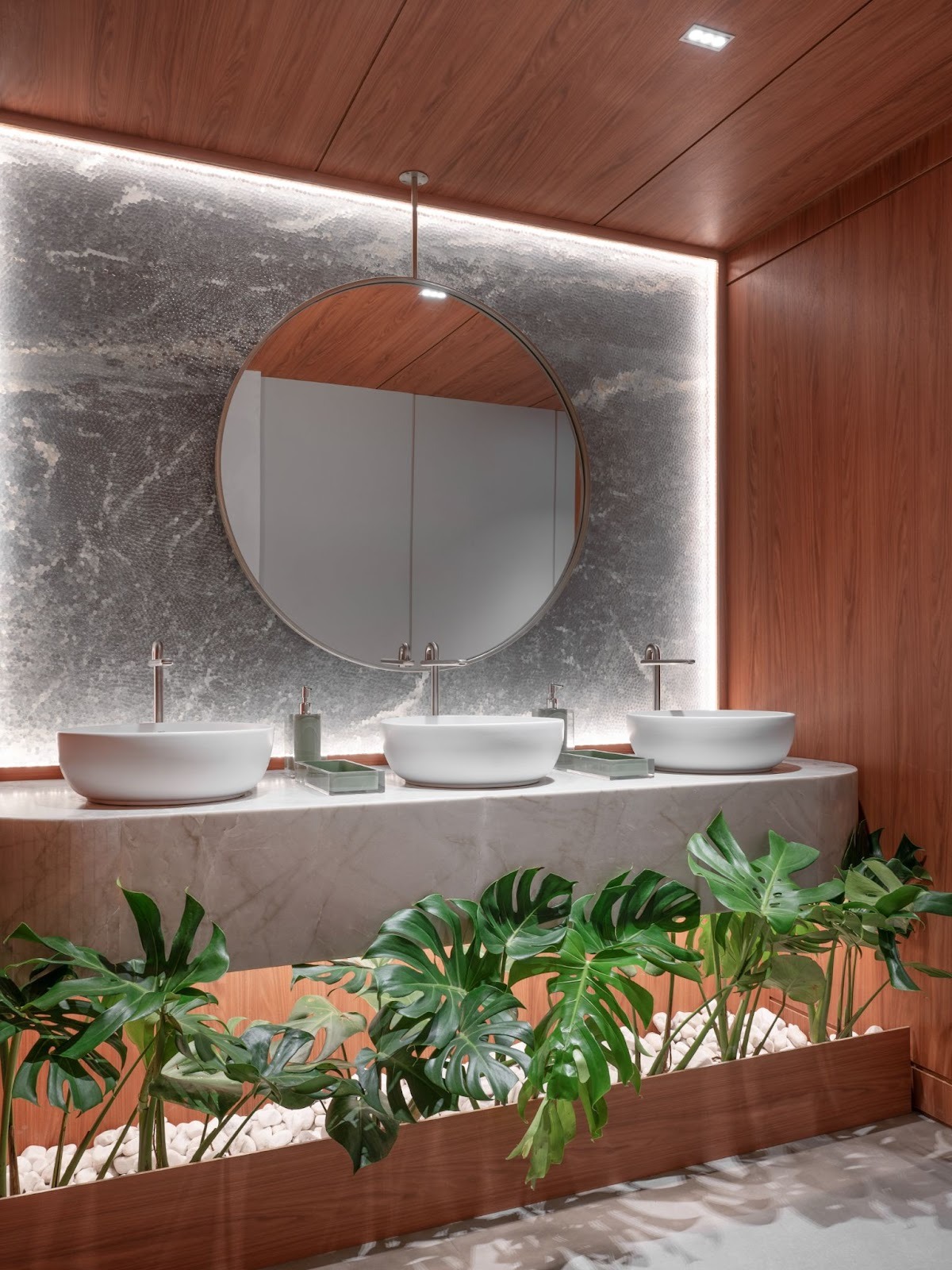 Mais do que espaços de uso coletivo, os banheiros foram concebidos como ambientes de acolhimento e contemplação, inspirados na fé, na natureza e no conceito de refúgio. As profissionais traduzem o tema Semear Sonhos em uma proposta que resgata o sentido de conexão interior: um local onde o visitante encontra calma, silêncio e beleza nos detalhes.