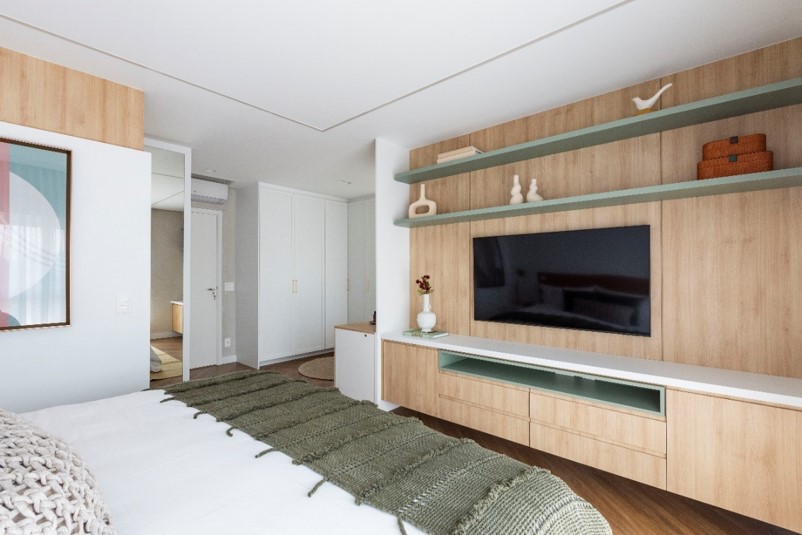 Com uma marcenaria bem planejada é possível desenvolver o painel de sustentação da TV, além de rack, nichos e prateleiras. Tudo isso somado com possíveis divisórias para outros ambientes. "Em um dos nossos trabalhos, onde a parede em frente a cama virou a protagonista, conseguimos uma conexão com o closet, desenvolvendo um rack que segue até a penteadeira", diz Mari Milani. O resultado não poderia ter ficado mais estilizado, com prateleiras, gavetas e nichos num tom mentolado de verde e ripas de madeira que delimitam os dois cantinhos.