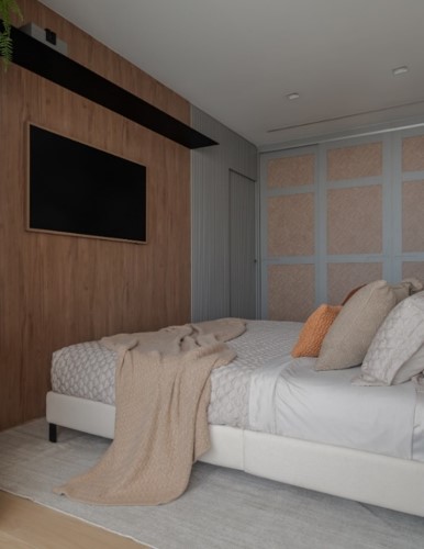 Um dos locais favoritos para a instalação da TV no quarto, essa parede pode se tornar protagonista do décor e oferecer múltiplas soluções de otimização do espaço