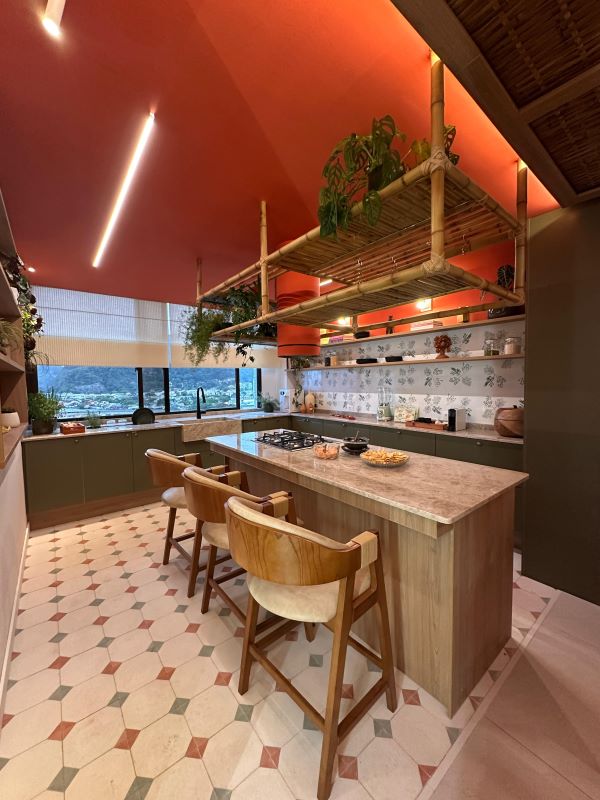 Inspirada na união, no acolhimento e no afeto, a cozinha criada pelas arquitetas foi pensada para ser um local onde a criatividade flui e as pessoas se sentem convidadas a permanecer e compartilhar momentos inesquecíveis. As cores quentes, como a terracota, e os materiais com texturas agradáveis transmitem aconchego e acolhimento, transformando a cozinha em um verdadeiro espaço de convivência, além de ser um ambiente de celebração do carinho e do cuidado entre os moradores e seus convidados.