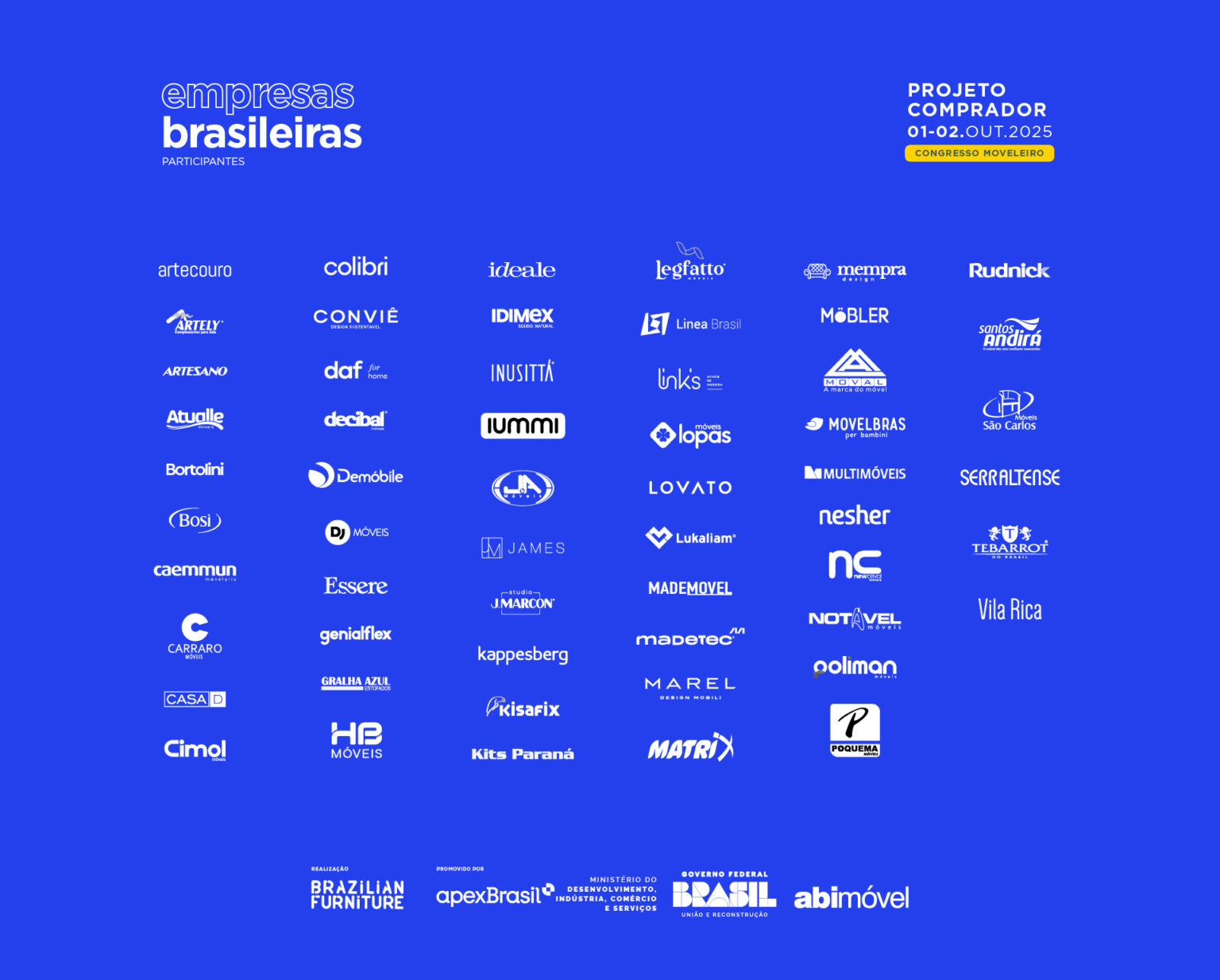 A iniciativa, promovida pela ABIMÓVEL (Associação Brasileira das Indústrias do Mobiliário) em parceria com a ApexBrasil (Agência Brasileira de Promoção de Exportações e Investimentos), integra o calendário do Projeto Setorial Brazilian Furniture. Nesta edição, a ação conecta 56 fabricantes brasileiros a 20 compradores internacionais qualificados oriundos de 11 países: Argentina, Uruguai, Paraguai, Chile, Peru, Bolívia, Panamá, República Dominicana, Marrocos, Reino Unido e Moçambique. Fomentando, assim, relações comerciais e abrindo novos caminhos para as exportações de móveis em diferentes regiões do mundo.