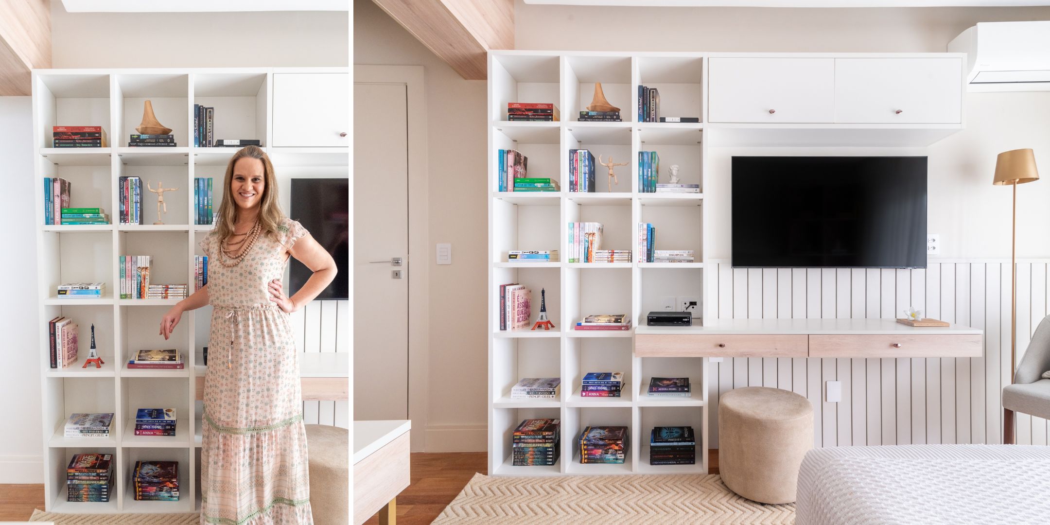 "Antes de escolher o local onde os livros serão expostos, o morador precisa avaliar qual estilo decorativo quer seguir e onde serão colocados", comenta. Neste projeto, os livros são distribuídos de acordo com suas coleções, tamanho e cores, como os pretos juntos e os demais coloridos em outra parte da estante.