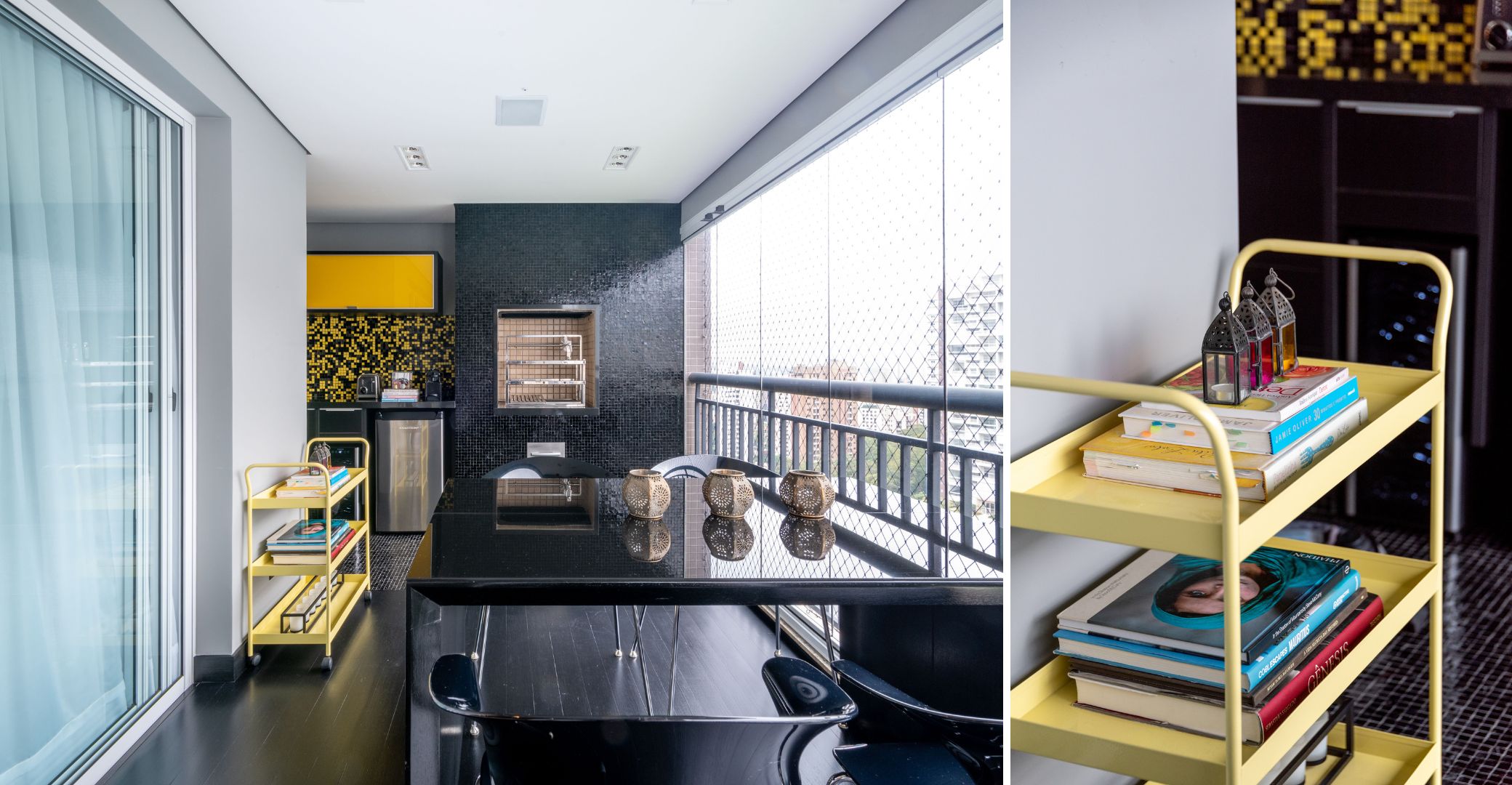 Neste projeto, a aposta foi usar o amarelo do carrinho para contrapor o preto, deixando o visual supermoderno, inclusive na decoração junto aos livros | Projeto da arquiteta Isabella Nalon | Foto: Julia Herman