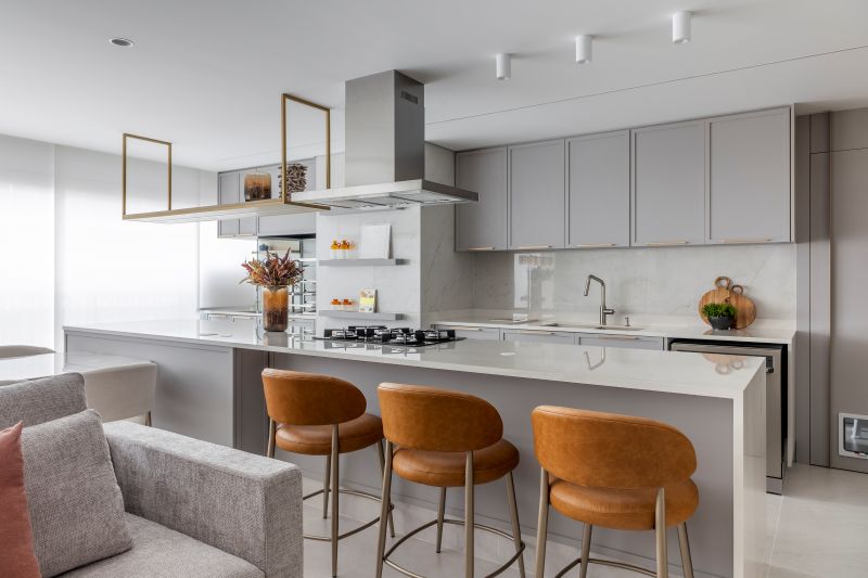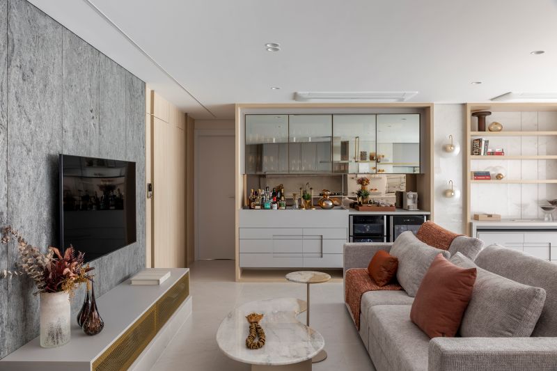 A cozinha segue o mesmo tom claro e atemporal, com armários cinzas, iluminação linear embutida e uma bancada em Ultra compacto que conecta as áreas sem interrupção visual. A cristaleira e bar iluminados e com acabamento em vidro reflecta adicionam sofisticação à composição, ao mesmo tempo em que respondem ao hábito de receber dos moradores.
