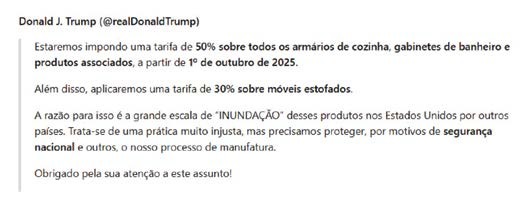 Na noite desta quinta-feira (25), o presidente dos Estados Unidos, Donald Trump, anunciou em sua rede social “Truth Social” a imposição de novas tarifas globais sobre móveis importados. A medida deve entrar em vigor já a partir de 1º de outubro de 2025.