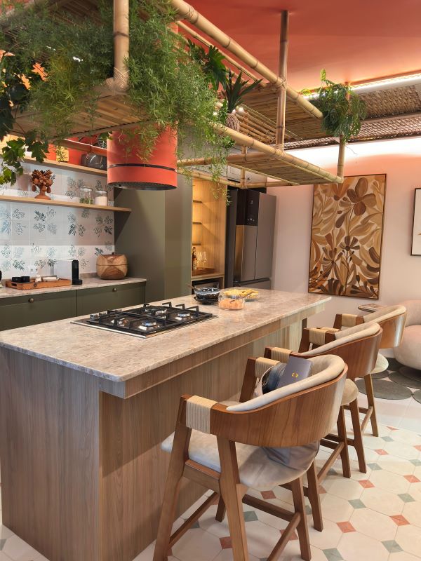 Inspirada na união, no acolhimento e no afeto, a cozinha criada pelas arquitetas foi pensada para ser um local onde a criatividade flui e as pessoas se sentem convidadas a permanecer e compartilhar momentos inesquecíveis. As cores quentes, como a terracota, e os materiais com texturas agradáveis transmitem aconchego e acolhimento, transformando a cozinha em um verdadeiro espaço de convivência, além de ser um ambiente de celebração do carinho e do cuidado entre os moradores e seus convidados.